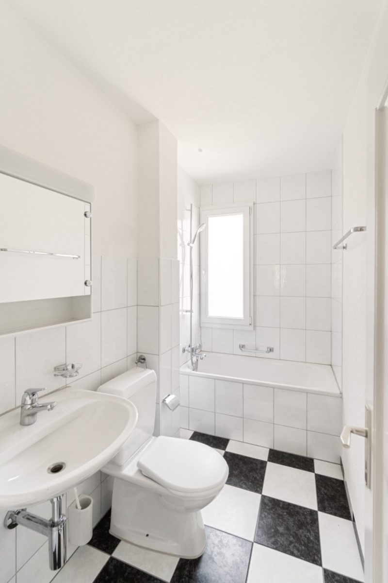 - Helles Badezimmer mit Badewanne, Lavabo, WC, Spiegelschrank und Fenster für natürliche Belichtung